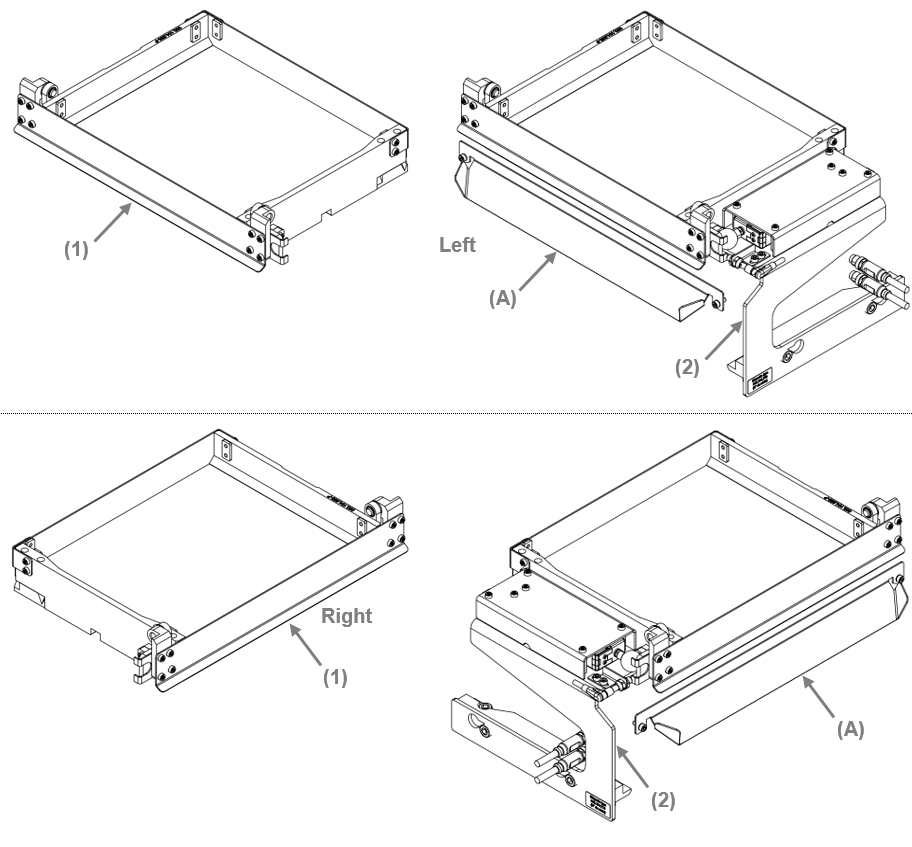 (A) einem Entleerungsrahmen mit einer integrierten Klappe, um Teile entweder nach links oder nach rechts zu entleeren. Er enthält einen elektrischen Aktuator und einen Sensor, um ein ordnungsgemässes Schliessen der Klappe zu ermöglichen.