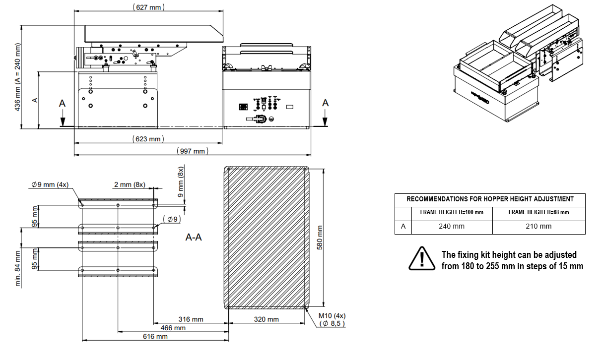 Le kit de fixation modulaire permet de positionner la trémie à une hauteur parfaitement adaptée à aux Asycubes 380/530. Les instructions de montage sont expliquées ci-dessous :