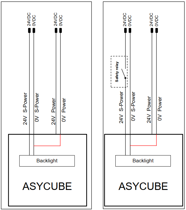 Le schéma de connexion suivant montre la manière de connecter l’Asycube selon que votre application nécessite ou non l’utilisation d’un relais externe pour garantir que le rétroéclairage est bien éteint. Dans tous les cas, Power (l’alimentation) et S-Power (l’alimentation-S) doivent être fournies pour utiliser le rétroéclairage.