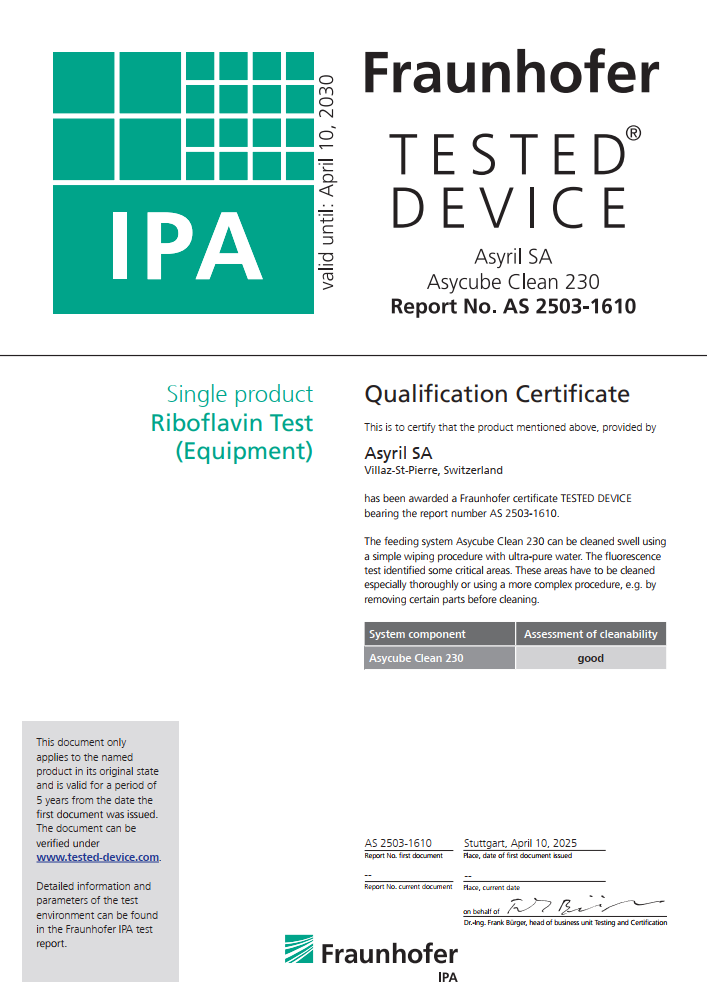 This certificate is provided for illustrative purposes only. The official certificate is issued in paper format and included with each Asycube Clean unit.