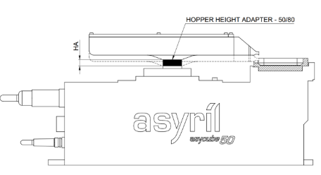 Lorsqu’une plateforme plus épaisse doit être conçue, la hauteur de la trémie peut être augmentée d’une valeur HA en utilisant l’ADAPTATEUR DE HAUTEUR DE LA TRÉMIE - 50/80. HA max = 7.5mm en option.